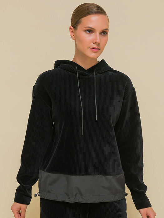 Женская плюшевая толстовка со вставкой из гладкой курточной ткани. Сочетание материалов с разной фактурой — актуальный тренд сезона. Свободная толстовка из трикотажного вельвета со спущенным плечом подарит вам ощущение комфорта и уюта. Худи с капюшоном на кулиске,  защитит от холода и ветра. По низу изделия также есть кулиска — её можно затянуть и получится кроп-толстовка. Худи однотонное, без принта. Неприхотливо в уходе. В составе ткани преобладает высококачественый хлопок — толстовка мягкая и прекрасно пропускает воздух. Полиэстер и эластан обеспечивают формоустойчивость надолго. Модель представлена в двух цветах. Чёрная толстовка — практичный, базовый вариант. Серое худи также универсально. Размерный ряд: XS (42); S (44); M (46); L (48); XL (50). Толстовка подходит женщинам, девушкам, девочкам-подросткам. Она идеальная для работы, учёбы, отдыха, перелётов, прогулок. А также может быть использована в качестве домашней одежды. Худи можно носить осенью и весной (демисезон), зимой и в прохладную погоду летом. Такую толстовку легко комбинировать с разными моделями брюк. Она станет замечательным подарком сестре, подруге или маме на Новый год или любой другой праздник.