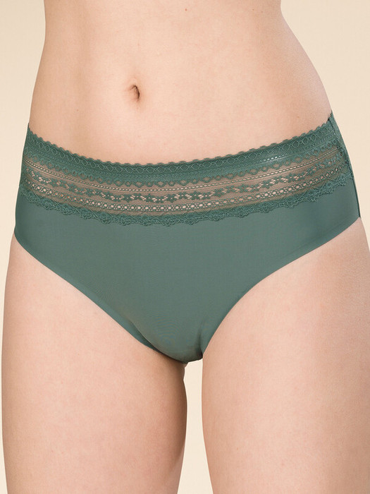 Женские трусы-слипы с высокой посадкой. Изготовлены по бесшовной технологии с минимум швов. Кромки по ноге и по талии подогнуты и приклеены, хлопковая приклеенная ластовица.  Нежное геометричное кружево по линии талии высотой 5 см – не передавливает тело и не натирает кожу.  Модель оценят те, кто ищет незаметное и невесомое белье на каждый день или особого случая.