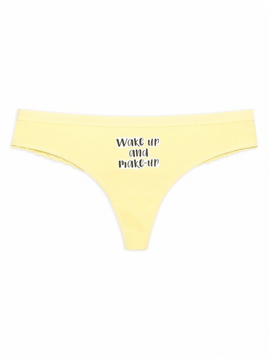 Женские трусики стринги. Низкая посадка. По талии и по ноге обработка эластиком. По спинке кружево. Прочный принт. Перевод Просыпайся и нанеси макияж. Продольный шов по спинке.