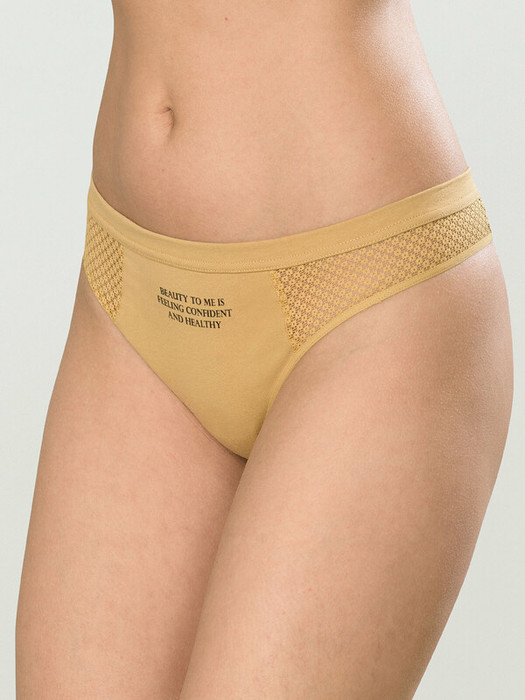 Женские трусы-стринги с низкой посадкой с тканой резинкой, в составе хлопок и эластан для практичности. Эластичная сетка по бокам – тренд на прозрачность. Прекрасный вариант дышащего нижнего белья на каждый день, для фитнеса и путешествий. Лаконичный текстовый принт придает модели спортивный вид, перевод – Для меня красота – это чувствовать себя уверенной и здоровой. Идеально сочетается с базовым топом Pelican.