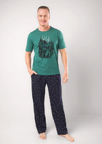 Мужская пижама выполнена из хлопкового полотна, состоит из брюк и футболки. Брюки с поясом на резинке, по бокам расположены карманы. Футболка однотонная, с коротким рукавом и круглым вырезом горловины, оформленным бейкой. Спереди нанесён принт.