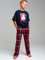Новогодняя пижама для подростков,состоящая из футболки и брюк. Футболка свободного кроя спереди украшена милым тематическим принтом. Брюки прямые среднего объема с эластичным поясом.