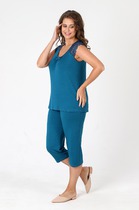 Пижама женская из гладкокрашенного трикотажного вискозного полотна, состоящая из футболки и шорт. Футболка - слегка расширенная книзу, с короткими рукавами покроя «реглан» и горловиной овальной формы. Проймы и горловина окантованы основным материалом. По срезу горловины выполнена небольшая сборка. Нижние срезы рукавов обработаны узкой обметочной строчкой. Шорты – свободного покроя, удлиненные, с эластичной тесьмой по талии.