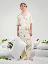 "Костюм-пижама для беременных и кормящих женщин. Футболка с V-образной горловиной, короткими рукавами, со сборкой на резинку спереди, под грудью. Шорты с уменьшенной высотой спереди для их комфортного расположения под животом, расширенные книзу.