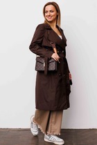 Двубортный плащ с поясом способен подчеркнуть красоту женской фигуры. Традиционный классический образ дополнен декоративными элементами, делающими модель более эффектной. К таким деталям можно отнести пагоны, создающие иллюзию более широкого плеча, ремешок на горловине, меняющий форму воротничка, а также затягивающие ремешки на рукавах, с помощью которых можно укоротить их длину. Модель прекрасно смотрится без пояса, идеально скрывая все особенности фигуры.