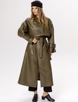 Плащ в длине миди, выполнен из ткани с водоотталкивающей и грязеотталкивающей обработкой. Силуэт слегка расширенный к низу. Отложной воротник с цельнокроеной стойкой. Центральная застёжка на петли и пуговицы. Спереди функциональные карманы-листочки. Рукава кроя реглан, по низу обработаны паты с застежкой на пуговицы. Спинка со средним швом со шлицей по низу. Плащ на подкладке.