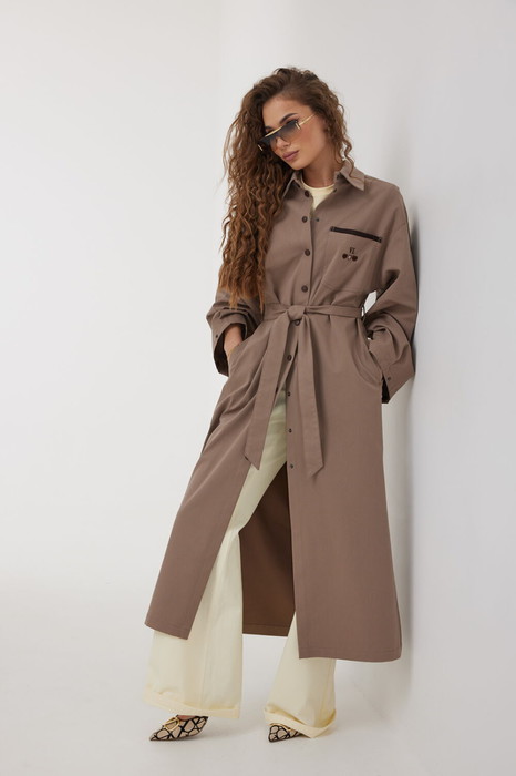 Плащ женский, свободного силуэта без подкладки. Воротник отложного типа. Рукав широкий спущенный с патой. В боковых швах карманы и высокие разрезы. Застежка на кнопки. По левой части переда накладной карман с вышивкой.