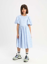 Платье для девочки из трикотажного хлопка с набивным рисунком. На спинке застежка-планка на двух кнопках. На полочке принт. Юбка со сборкой на талии. Спереди платье украшено декоративным бантом.