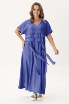 Стильный комплект, состоит из верхнего платья-рубашки и нижнего платья на бретелях. Верхнее платье прямого силуэта, с центральной застежкой по переду на петли и пуговицы, втачным воротником с отрезной стойкой, на груди с клапанами. Спинка с отрезной кокеткой, переходящей на перед. Рукав втачной, по низу с манжетой и застежкой на пуговицы. Нижнее платье-комбинация на бретелях, с нагрудными вытачками по переду. В комплекте идет съемный кожаный пояс, с металлической пряжкой.