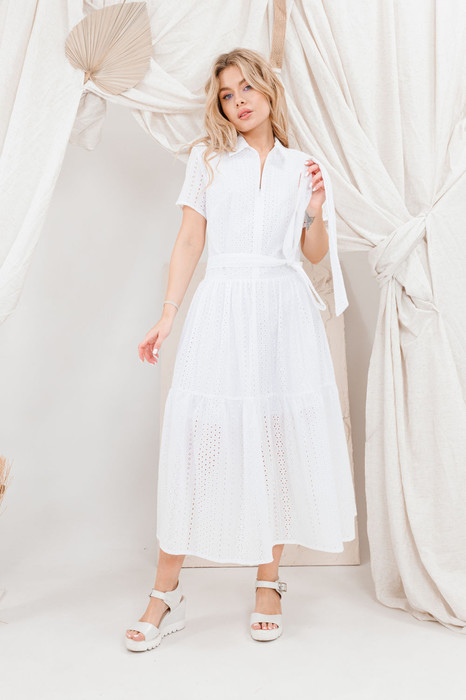Натуральное платье из красивого ришелье. Талия занижена, что делает образ более стройным, по переду застежка на потайную тесьму-молнию которая позволяет регулировать степень открытости декольте. Пояс сьемный. Хлопковая подкладка по переду и юбке платья.