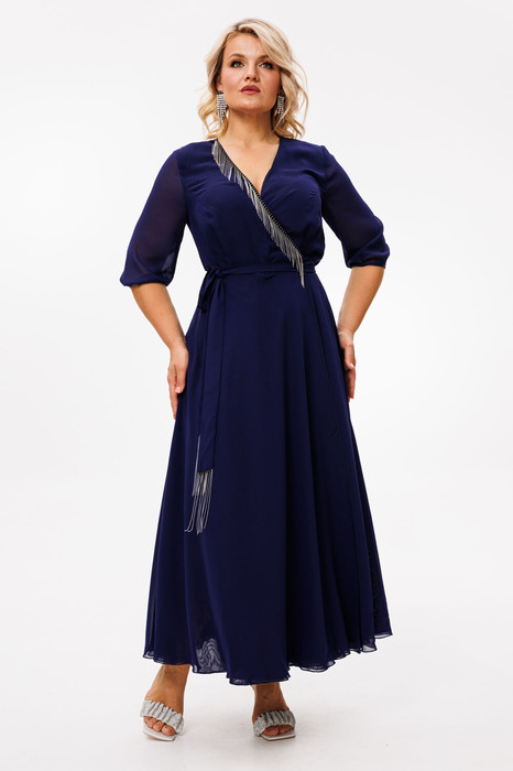 Элегантное женское платье отрезное по линии талии. Благодаря своему крою прекрасно будет смотреться на любой фигуре, скрывая недостатки. Спинка и полочка -двойные. Юбка-солнце-клеш (двойная). На лифе переда-нагрудные вытачки с проймы и по 2-е мягкие складки по талии. Спинка со средним швом и выточками. В правом боковом шве лифа - отверствие для пояса,который протягивается и завязывается по переду. Рукав втачной,одношовный, длиной 3/4. По низу рукава - мягкие складки. В качестве декора - металлизированная бахрома по горловине полочки и по краю пояса. Длина платья: верхняя часть: -(50-52)- 36см,(54-56)-37 см., юбка (50-56)-100см. Длина рукава: (50-56)-41 см.