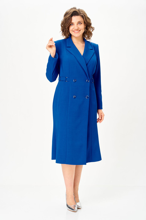 Платье полуприлегающего силуэта, выполнено из однотонной ткани. Платье длиной за колено, с небольшим расклешением по низу. Полочка платья с двубортной застежкой на пуговицы.  Полочка с вертикальными рельефами. В шве притачивания бочка к средней части полочки обработан карман. Горловина V-образной формы, с отложными лацканами и воротником пиджачного типа. В области талии выполнен декоративный элемент из хлястиков и металлических рамок.