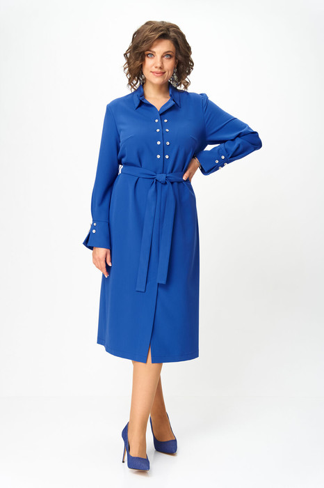 Полочка платья с центральным швом, в верхней части которого выполнена оригинальная застежка на петли и пуговицы, в нижней части центрального шва полочки обработана шлица. Полочка с нагрудными вытачками. Горловина круглой формы с воротником рубашечного типа. Спинка со средним швом. Рукав втачной, одношовный, длинный, по низу со складкой и притачной манжетой. Манжета с разрезом по низу и декором из пуговиц.