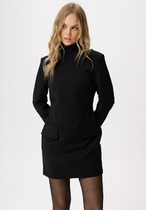 Полочка платья с вертикальными рельефами в верхней части и с отрезной боковой нижней частью, на которой выполнены карманы и складки в шве по талии. Застежка двубортная, на петлю и пуговицу. Горловина V-образной формы, обработана воротником типа “апаш” из отделочной ткани. Спинка со средним швом и вертикальными рельефами. Рукав длинной 3/4, втачной, двухшовный, с отделкой по краю.