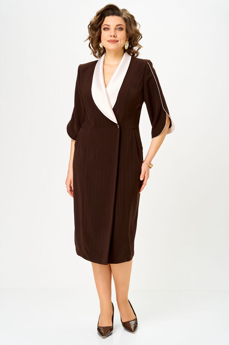 Полочка платья с вертикальными рельефами в верхней части и с отрезной боковой нижней частью, на которой выполнены   карманы и складки в шве по талии.  Застежка двубортная, на петлю и пуговицу. Горловина V-образной формы, обработана воротником типа “апаш” из отделочной ткани.  Спинка со средним швом и вертикальными рельефами. Рукав длинной 3/4, втачной, двухшовный, с отделкой по краю.