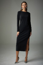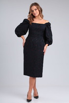 Платье характеризуется гармоничным сочетанием вольного кроя и конструкторских линий.