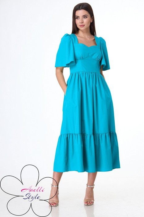 Платье длины миди, полуприлегающего силуэта, отрезное по линии талии.