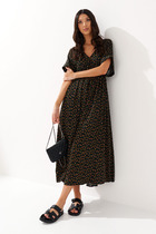 Платье из шелковой принтованной ткани. Прямой свободный силуэт с цельнокроенными рукавами с воланами по низу. Элегантный v-образный вырез горловины со шнуровкой по спинке. В боковых швах расположены функциональные карманы. Низ платья украшает притачной волан. Дополнено съёмным поясом. Отличный вариант для нарядного платья. Может быть использовано и для городской моды с удобной обувью и свободным жакетом из нашей коллекции.