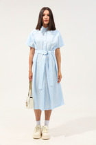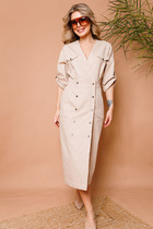 Прямой силуэт,  цельнокроеные рукава, V-образный вырез горловины, перед со средним швом, в котором расположен разрез. Дополнено съёмным кожаным ремнём.