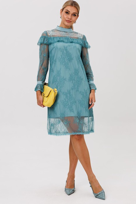 Это платье, сотканное из воздуха и тончайших нитей. Нежное кружевное полотно, подобно легкой дымке, обволакивает силуэт, заключая его в элегантные и строгие линии прямого кроя. Изысканность кроется в деталях: кокетки, украшающие лиф спереди и сзади, мягко ниспадают изящными волнами, подчеркивая линию плеч и даря образу трогательную, почти что хрупкую грацию.