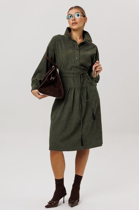 Длинный рукав с манжетой, спущенное плечо и волан со сборкой придают платью легкость и воздушность. Притачная планка на поясе выгодно подчеркивает талию, а пояс с кисточками привлекает внимание. Не оставит без внимания отложной воротник на стойке и застежка на пуговицы, подчеркивающие линии декольте.