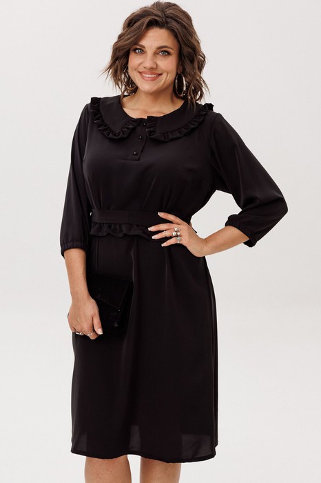Круглый вырез горловины обработан отложным воротником с рюшем, придающим платью шарм и изысканность.