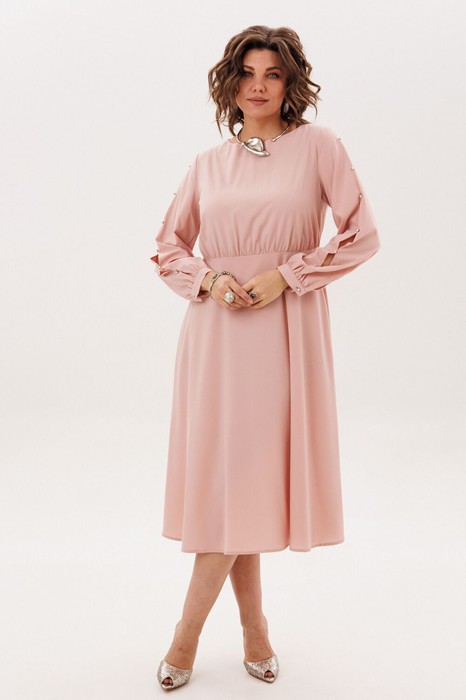 Это платье в цвете «дымчатая роза», в котором каждая деталь дышит романтикой и безупречным вкусом. Мягкий силуэт с отрезной линией талии словно обнимает фигуру, создавая идеальный баланс между невесомостью и структурой. Длинные рукава, мягко присборенные у изящных манжет, хранят в себе загадку, а маленькие разрезы, скреплённые перламутровыми жемчужинками, добавляют образу трепетной нежности.