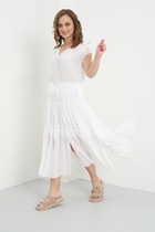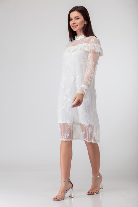 Кокетки по переду и спинке с воланом демонстрируют линию плеч и придают хрупкость образу.