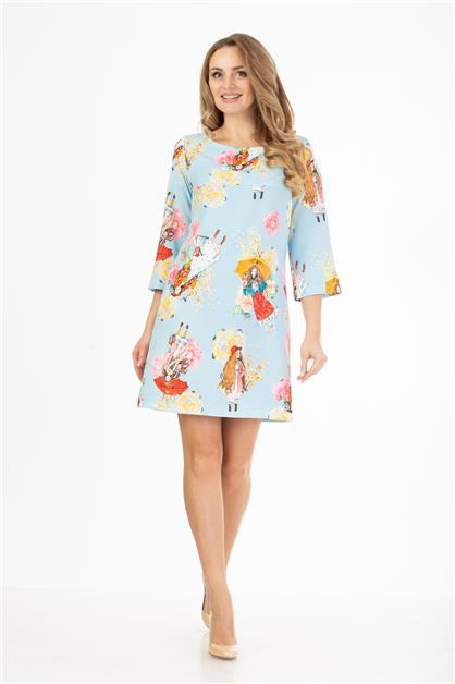 Платье длиной выше колена, с геометрическим принтом, молочного и голубого оттенков с принтом «девочка с зонтиком». А-образного силуэта.
