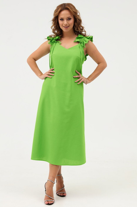 Платье полуприлегающее А-силуэта с тонкими бретелями на завязках. Горловина по переду V-образной формы. По переду нагрудные вытачки, а спинка - с рельефами. Застежка на потайную молнию в боковом шве. В комплекте съемные рюши на бретели из основной ткани.