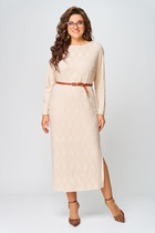 Платье прямого силуэта длиной миди. Горловина с вырезом "каре". По переду платья нагрудные вытачки. В боковых швах обработаны разрезы. Рукав втачной прямой длиной 7/8.