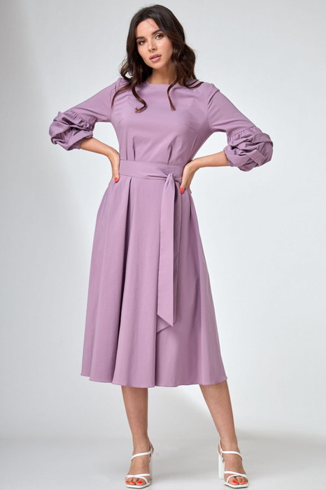 Платье из хлопковой ткани полуприлегающего силуэта, расклешенное книзу. Вырез горловины округлой формы. Платье отрезное по линии талии. По переду обработаны нагрудные вытачки. Спинка с застежкой молнией в среднем шве. Рукав втачной динный, на резинке понизу, с горизонтальным подрезом и с защипами. Пояс из основной ткани.