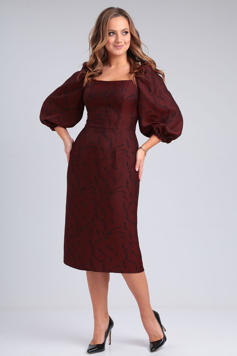 Платье из костюмно-плательной ткани приталенного силуэта длиной чуть ниже колена. Вырез горловины квадратной формы - каре. Отрезное по линии талии. Перед и спинка с рельефами. По спинке средний шов, в котором вставлена потайная молния, внизу разрез. Рукав втачной длиной 3/4, по окату собран на резинку, в нижней части рукава сборка на резинку.