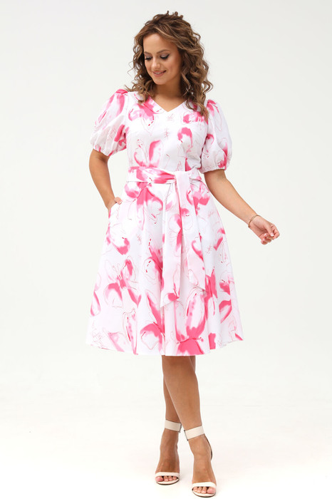 Платье полуприлегающего силуэта, расклешенное книзу. Горловина V-образной формы. Платье отрезное по линии талии. По переду нагрудные и талиевые вытачки. Спинка с рельефами и потайной застежкой молнией в среднем шве. Рукав втачной короткий, со сборкой по низу. В комплекте съемный пояс из основной ткани.