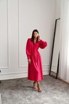 Платье полуприлегающего силуэта с фигурным отрезом выполнено из нежно-розового полотна с принтом белый горох. Характеристики: отрезное, отрез фигурный, горловина V образный вырез, рукав втачной струящийся, низ свободного кроя на подкладке, в боковом шве - потайная молния. Длина платья 127 см, длина 34.