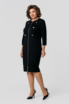 Платье прямого кроя выполнено из полотна черного цвета. Характеристики: прямой крой, отрезное, отложной воротник, застежка центральная на петли пуговицы, рукав свободного кроя спущен, по низу рукава резинка, низ в изделии на резинке на подгибе. Длина 84 см, длина 80 см.