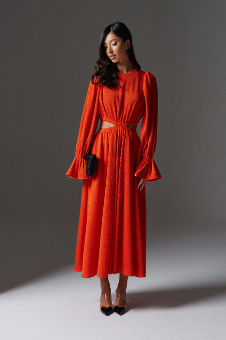 Платье полуприлегающего силуэта с декоративным разрезом выполнено из фактурного полотна оранжевого цвета. Характеристики: полуприлегающий силуэт, отрезное, по линии талии декоративный разрез разъединяющий верхнюю и нижнюю часть изделия, горловина овальная, рукав втачной, застежка потайная тесьма молния в среднем шве заднего полотна изделия, низ платья свободного кроя на подкладке.