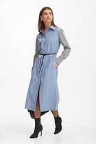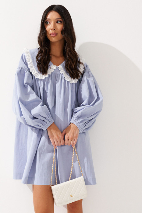 Платье прямого свободного кроя выполнено из голубого хлопкового полотна с акцентным воротником. Характеристики: прямой свободный крой, отрезное, отложной крупный воротник декорирован по периметру кружевом , рукав спущен , объемный, по низу рукава резинка. Длина по спинке 85 см, длина рукава от края горловины 63 см.