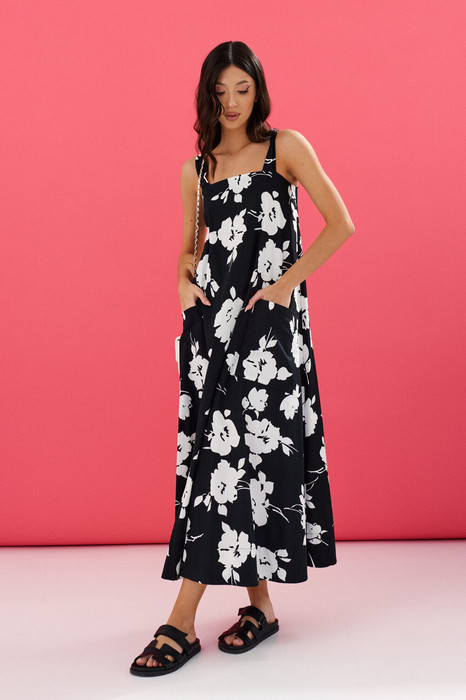 Платье свободного кроя на бретелях выполнено из черного полотна с контрастным принтом белые цветы. Характеристики: свободный крой, А-образный силуэт, подкладка, широкие бретели , прямой вырез горловины, по переду крупные накладные карманы, застежка потайная тесьма молния в среднем шве заднего полотна изделия. Длина от верхнего края бретели 129 см.