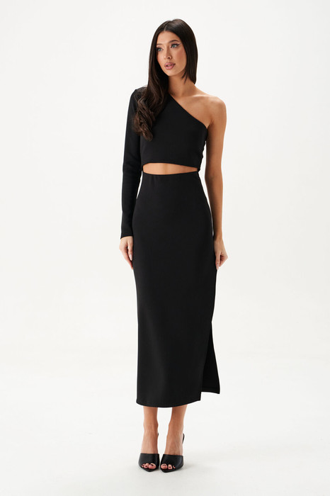 Платье на одно плечо выполнено из трикотажа черного цвета. Характеристка: платье на одно плечо с фигурным разрезом на талии по переду изделия, разрез по бокову шву - 63см. Длина рукава от края горловины - 74см, длина платья по спинке от плеча 132см.