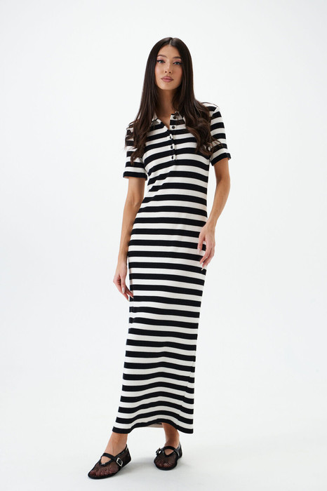 Платье-макси. Выполнено из трикотажного полотна. Прямой крой. Воротник-поло, отложной. Застёжка пуговички. Рукав втачной. Длина рукава от линии втачивания 22 см. Длина спинки 137 см