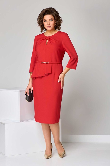Платье женское нарядное полуприлегающего силуэта, выполнено из плательной ткани. Вырез V-образный с драпировкой на пате. Изделие на подкладке, выполнено из высококачественного крепового плательного полотна.. Рукав три четверти. Платье отрезное по переду. Лиф с талиевыми вытачками. По линии талии поясок с украшением. Юбка переда с драпированной баской. Спинка с талиевыми вытачками. В центральном шве застежка-молния, по низу шлица.
