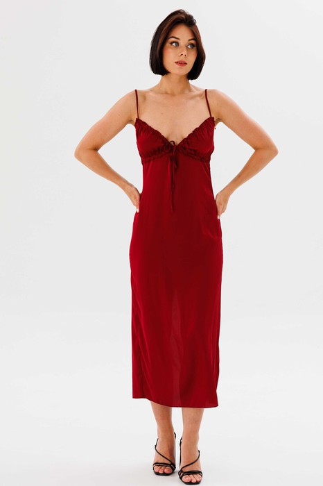 Платье-комбинация в длине миди, выполнено из шелка армани. Лиф настрочной, обработан сборкой, верх лифа обработан сборкой на резинку. По центру лифа обработаны декоративные шнурки из основной ткани Застежка- потайная молния по центральному шву спинки. По задней половинке платья обработан разрез