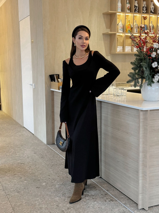 Платье в длине макси выполнено из трикотажа среднеей плотности. Верх платья обработан глубоким вырезом-лодочка и бретелями, имитирующими майку