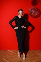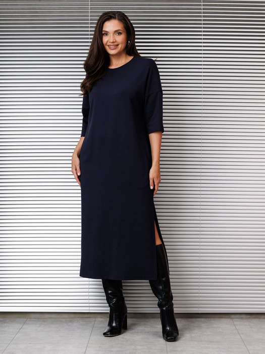 Платье женское трикотажное, свободное "оверсайз", со спущенной проймой и 3/4 рукавом, вырез горловины полукруглый с планкой, в боковых швах-карманы и разрез слева.