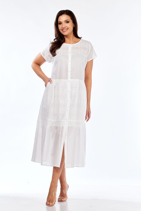Платье женское летнее, комбинированное из двух видов ткани: вышивки и однотона. Свободного силуэта, расширенное книзу, вырез горловины-полукруглый, рукав спущенный цельнокроенный, застёжка спереди на планку с пуговицами, по переду карманы со скосом, изделие частично на подкладке.
