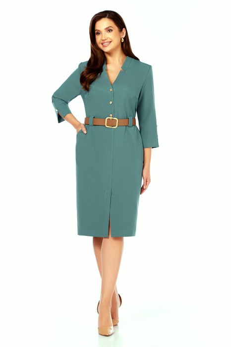 Женское платье полуприлегающего силуэта выполнено из однотонной плательно-костюмной ткани. Платье с центральной застёжкой на 3 петли и пуговицы . Перед со средним швом заканчивающимся шлицей, рельефами из пройм до боковых швов,в швах выполнены карманы,и нагрудными вытачками.Спинка цельная.По переду и спинке в области талии выполнены шлевки для ремня. Рукава втачные , двухшовные, длиной 3/ 4. Внизу верхнего шва рукава декоративные пуговицы и разрез. Вырез горловины фигурный со стойкой.