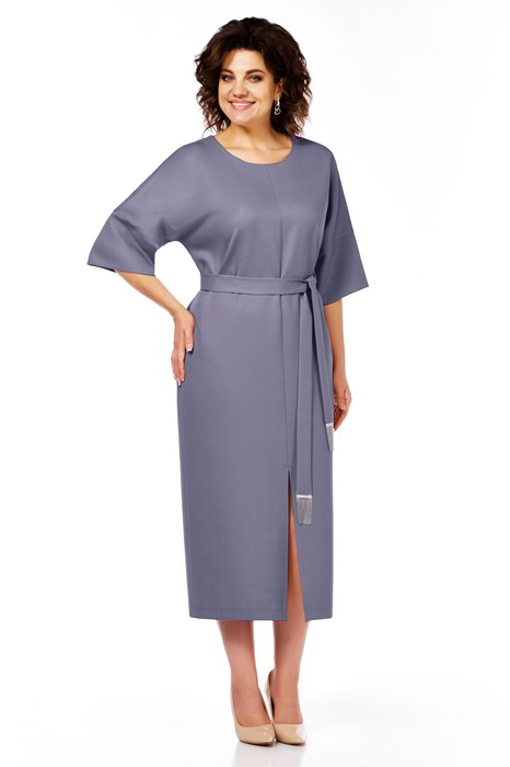 Платье укомплектовано поясом-завязкой из основной ткани с декоративной металлизированной бахромой на концах.