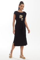 Платье женское свободного силуэта расширенное к низу выполнено из шифона.Перед и спинка с отрезной кокеткой ,нижняя часть выполнена из двух деталей внахлёст со складками по верхнему срезу. На спинке "капелька " и застёжка на навесную петлю и пуговицу. Рукава втачные одношовные длиной 3/4 со сборкой на резинку по низу.Круглый вырез горловины окантован. Платье на атласной подкладке от кокетки.