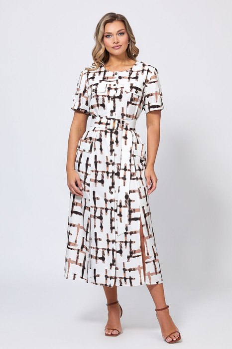 Это платье длины миди расклешённого кроя красиво садится по фигуре и придётся по душе ценителям элегантного дизайна. Модель: с округлым вырезом горловины; застёжкой на петли-пуговицы; с отделочными клапанами по переду; короткими рукавами с интересными отделочными патами и поясом из основной ткани, красиво подчёркивающим талию - сшита из экологичного дышащего материала на основе вискозы со стильным дизайном. Большие накладные карманы добавляют изделию функциональности, а разрезы в рельефах переда и в боковых швах добавляют силуэту динамики.